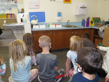 During story time today, I decided to teach the kindergartners about water. I told them that most of the Earth is covered with water, that ocean water is salty and we can't drink it. I used online videos to show the water cycle and then I showed them the different forms of water. I boiled water in my tea kettle, so they could see water vapor, which is a gas. They saw water in its liquid form and in two solid forms: ice and snow. Later, after the snow melted I dumped it into the clear bowl, so they could see how dirty it was. I reminded them to not eat snow that hasn't freshly fallen. They loved this science lesson and now they are "in the know" about water!
